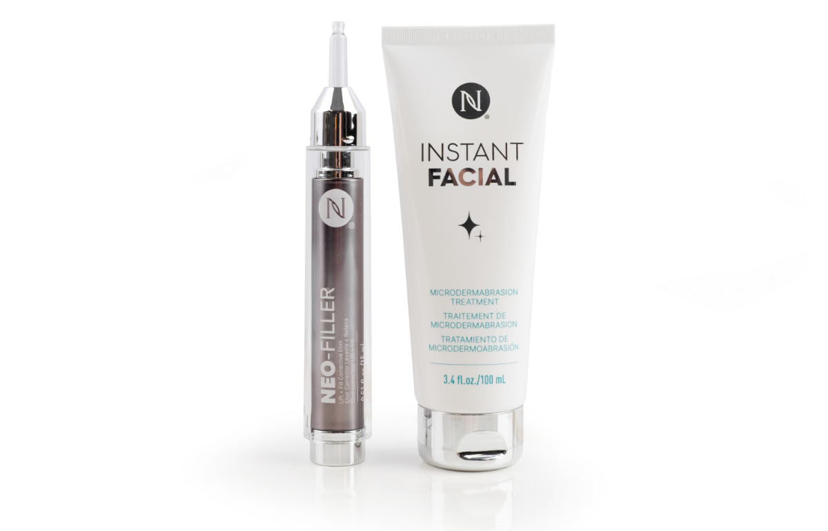 Our Neo-FILLER Lift + Fill Corrective Elixir and Instant Facial Microdermabrasion Treatment work together as the ultimate glow-getting set, delivering visible plumping, lifting, smoothing, and radiance. Think of it as your at-home alternative to two of the most coveted in-office treatments on the market—microdermabrasion and injectable fillers—minus the needles and pricey appointments.
